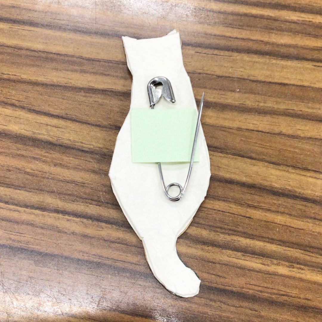 のり・ボンドが乾いてきたらひっくり返して裏面にピンをつけていきます。