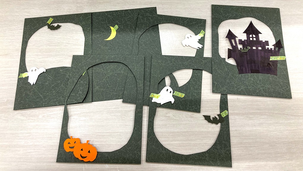 台紙の裏にスペーサーを貼り、先ほど切り抜いておいたおばけ達と台紙を交互に重ねてバランスを見ます。